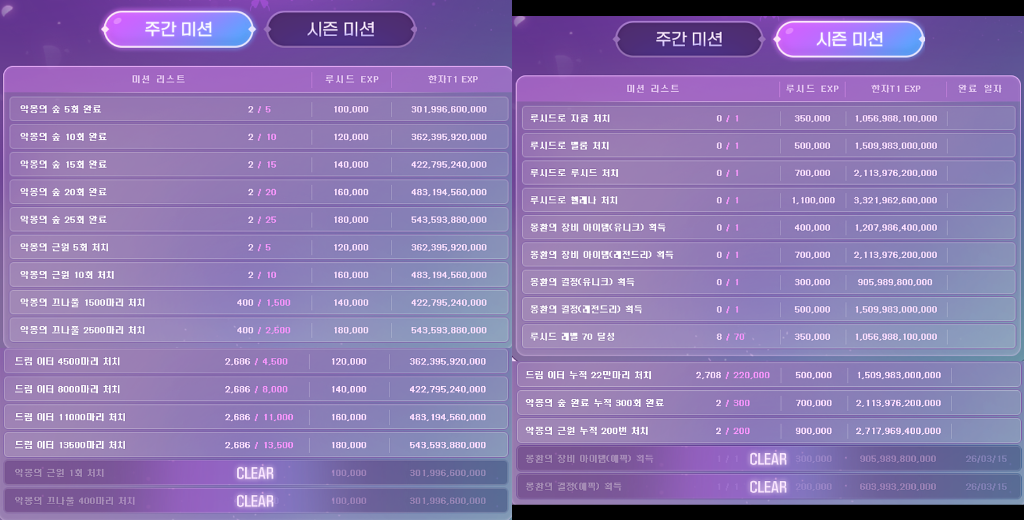 ⑦ ~ ⑨주간·시즌 미션 — EXP의 또 다른 거대한 원천